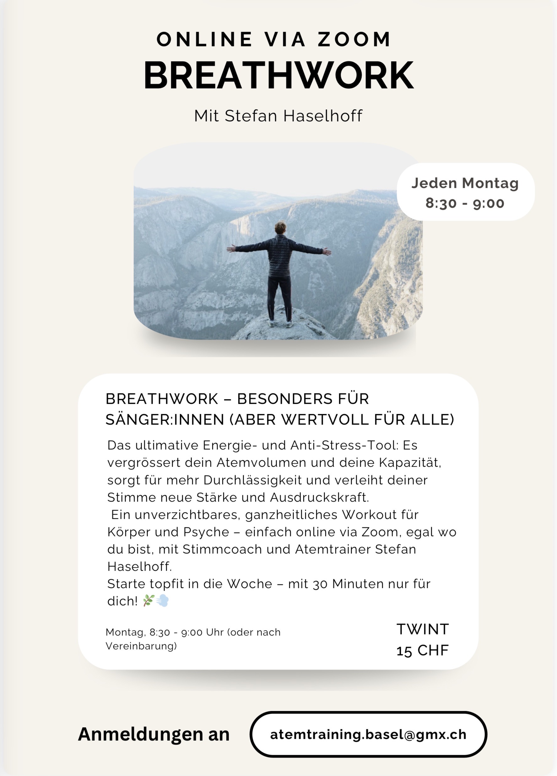 BREATHWORK stärkt dein Atemvolumen, fördert Durchlässigkeit und verleiht deiner Stimme neue Kraft und Ausdruck.